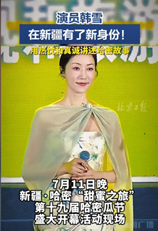 7月11日晚上新疆哈密开了第十九届哈密瓜节,现场有个大事儿就是请演员韩雪当了全市第一个文旅宣传大使。她上台唱了首叫《惟舞伊州》的歌。